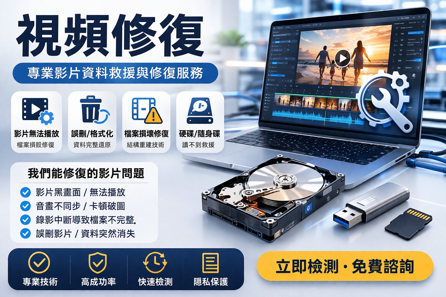 視頻修復(影片修復)是針對損壞、無法播放或檔案異常的影片進行專業修復與資料重建的技術服務,廣泛適用於硬碟、隨身碟、記憶卡、手機以及NAS等儲存設備中的影片檔案損壞問題。